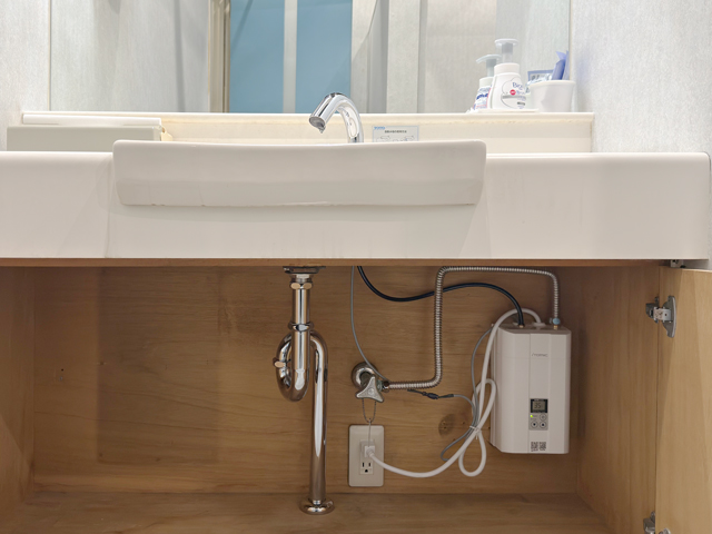 導入いただいた電気瞬間湯沸器EIXMミラブル水栓モデルは、非常に小型で設置スペースを選びません。また、マイクロファインバブルを生成する水栓がセットになっており、洗浄力が高いため、化粧室のみならず厨房でのバックヤードにおけるご採用を頂いている製品でもあります。厨房ショールームとして話題にしやすく、紹介ができる製品でもあるとのことで、導入いただきました。
