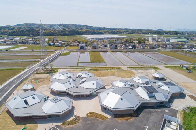 君津市の新たな子育て支援の拠点となるみふねの里保育園は保育・子育て支援を象徴するランドマークとして、子育て家庭のニーズに対応した子ども・子育て支援の実施と、民間保育施設とのネットワークの構築、保育の質の向上、保育のセーフティーネットとしての役割を果たしております。君津市立みふねの里保育園の園舎は、房総丘陵と田園風景に調和する集落のような木造園舎で、子どもたちが屋内外を自由に動き回れるように各部屋は八角形平面を採用しております。